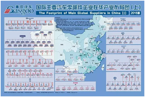 格局图(上)汇集了12家企业,包括:博世、佛吉亚、采埃孚、德尔福、本特勒、马瑞利、海拉、博泽、克诺尔、辉门、高田、万都